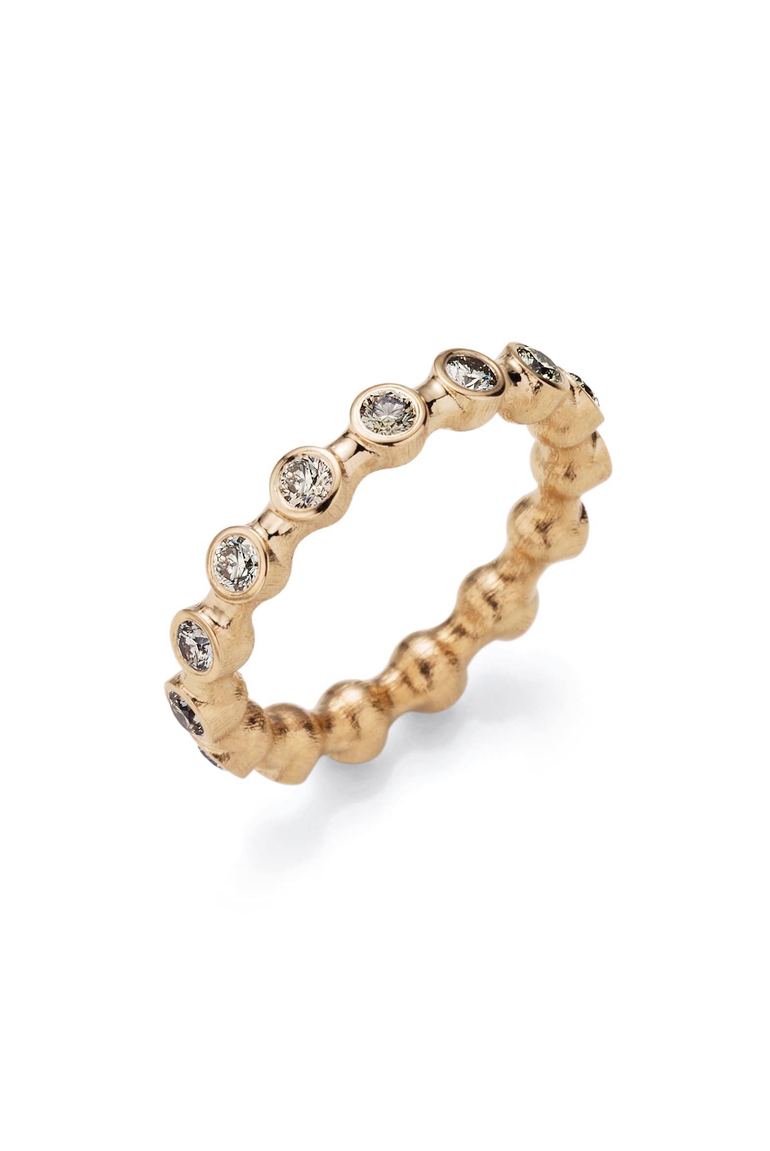 Viele kleine Goldkugeln reihen sich spielerisch aneinander, gehen sanft ineinander über und erwecken beim Tragen den Eindruck einer weich fliessenden Wellenbewegung am Finger.
