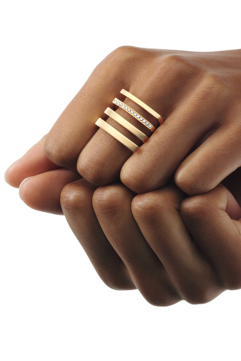 Ringe von Angela Hübel sind auffällige Objekte aus Gold, die sich der Hand, der Trägerin und dem Leben anpassen. Schmuckstücke, die erzählen: von der Kraft der perfekten Linie, von der Person der Besitzerin und vom Ideenreichtum der Designerin.