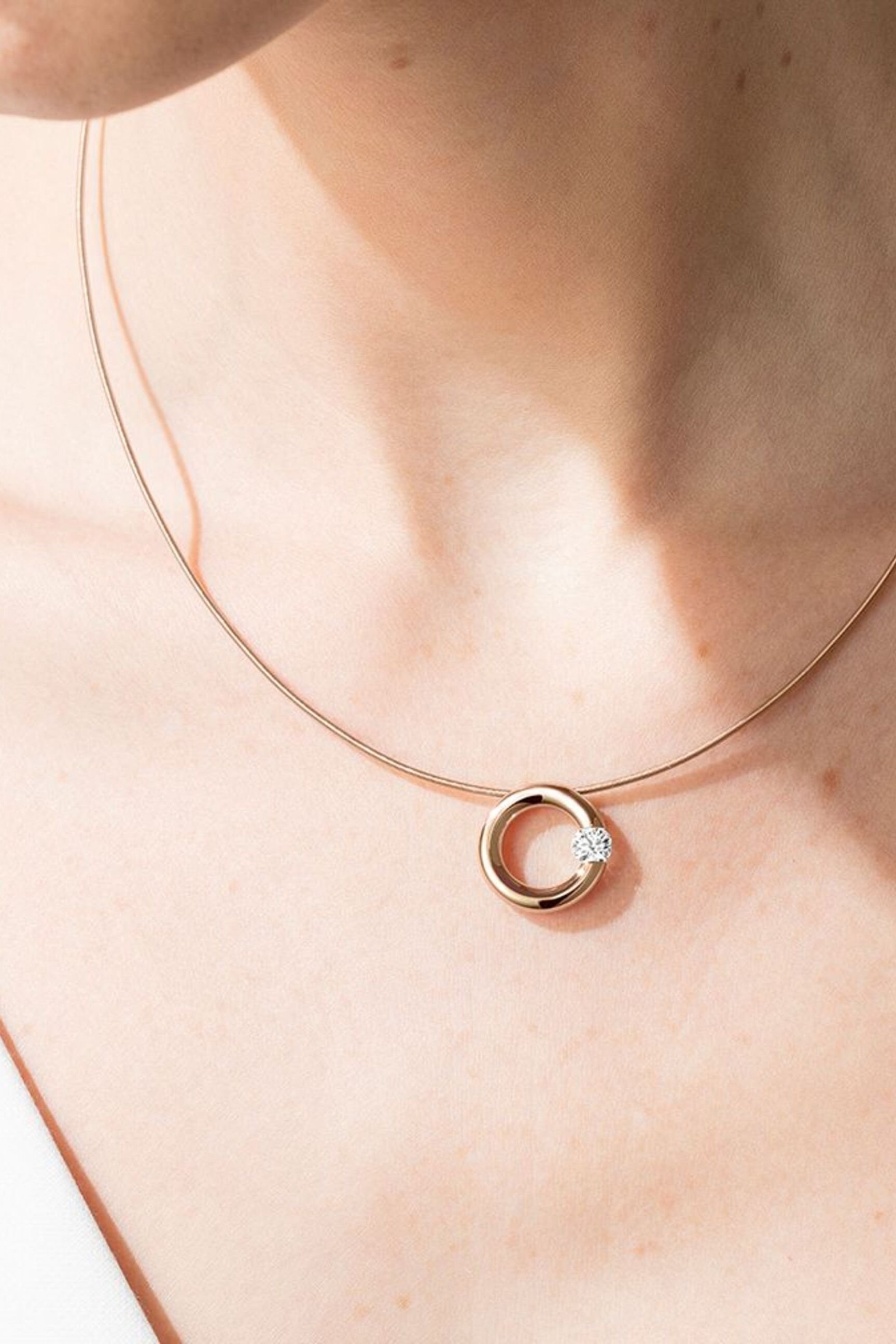 Die feinen Proportionen des Niessing Spannring Anhängers stellen höchste Ansprüche an die handwerklichen Fertigkeiten der Goldschmiede und Steinfasser. Der Brillant wird liegend eingespannt. So ist er dem Betrachter zugewandt, frei und doch geborgen: Ein kostbarer, funkelnder Brillant im Augenblick der Spannung.