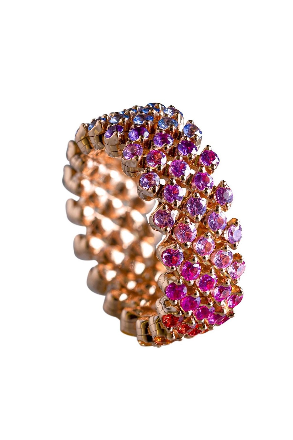 Dass ein Ring flexibel von der Trägerin in der Grösse geändert werden kann, ist an sich schon erstaunlich. Noch umwerfender erstrahlt nun der Multi-Size-Ring – ein Kultstück von Serafino Consoli – neu mit Saphiren in den Farben des Regenbogens. In einem perfekt abgestimmten Farbverlauf verleihen die natürlichen Saphire dem Ring eine absoluten Wow-Effekt.