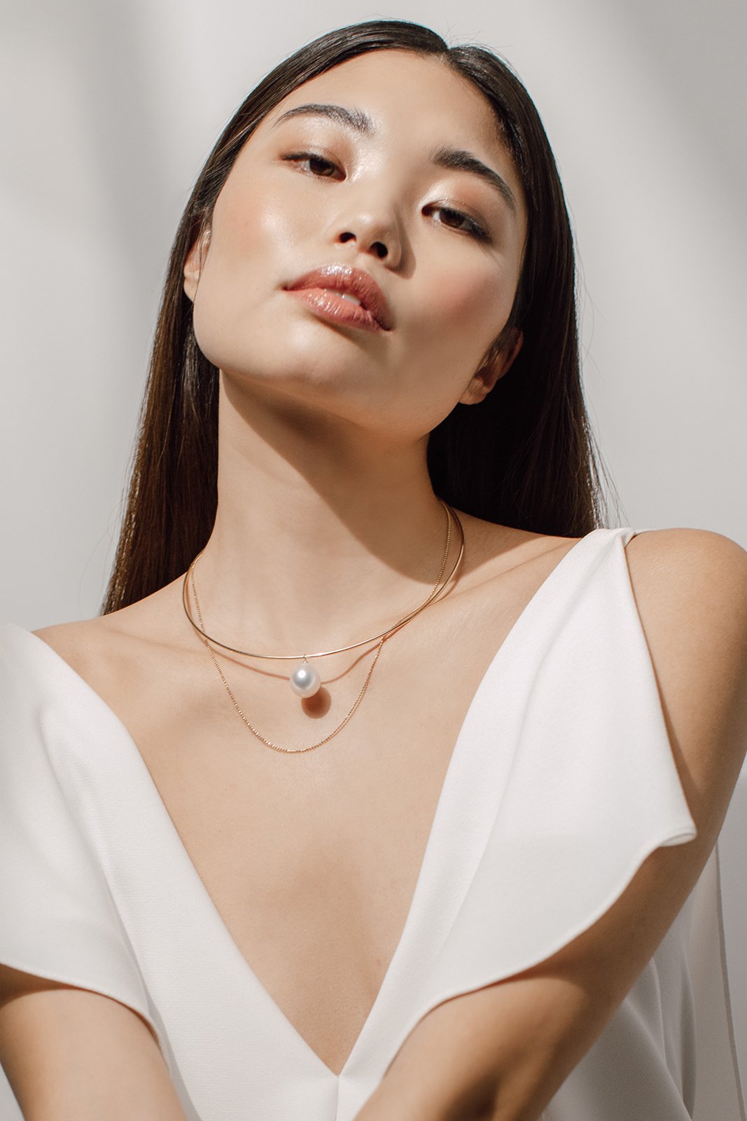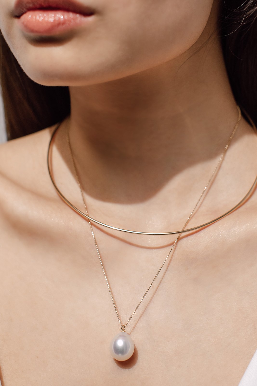 Das dreierlei tragbare Schmuckstück formt die Buchstaben O und V - Das Herzstück des Namens LOVE. Die ausdrucksstarke Südseeperle kann frei auf dem festen Reif sowie an der zarten Goldkette - lang oder kurz getragen - bewegt werden.