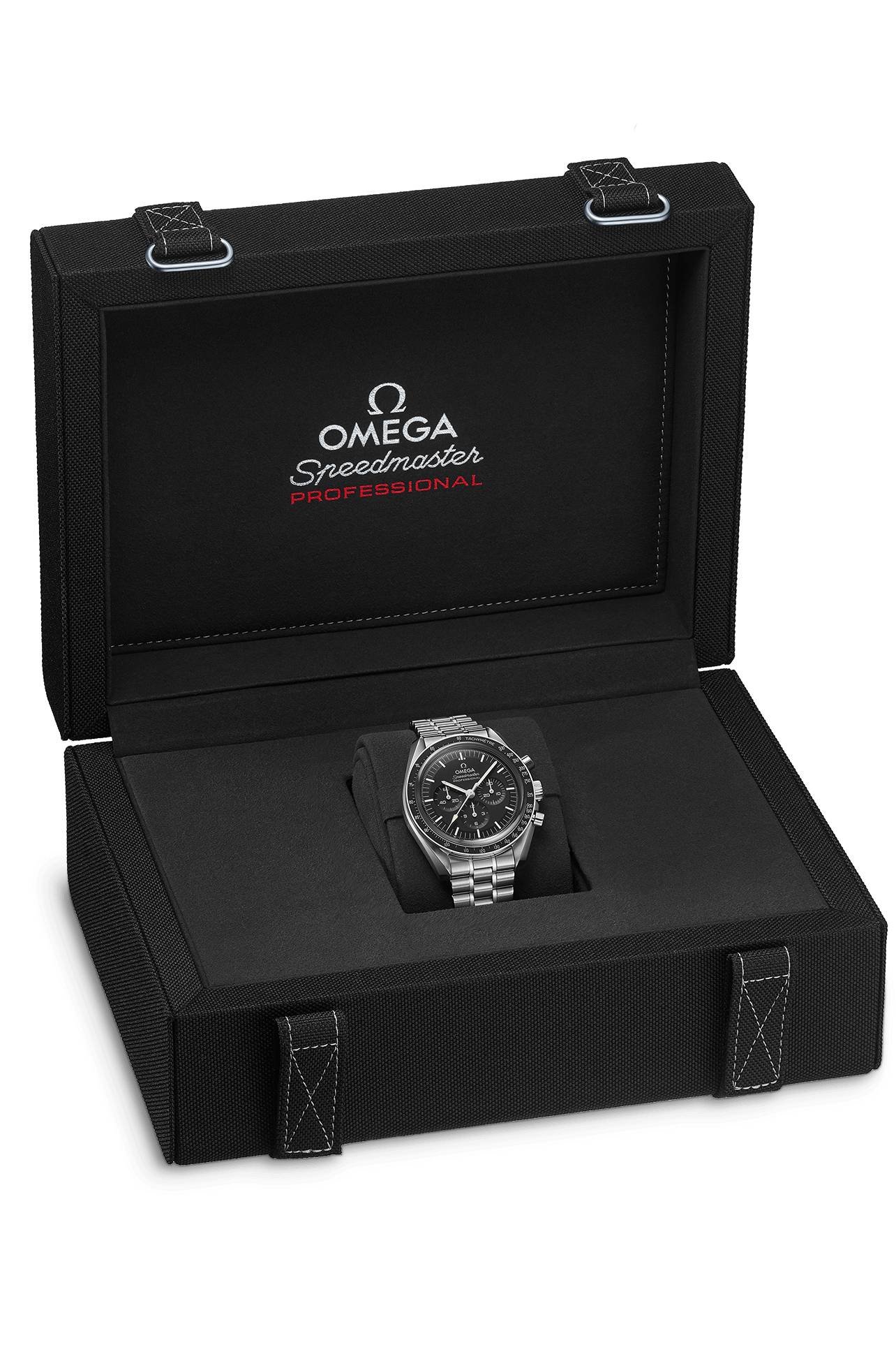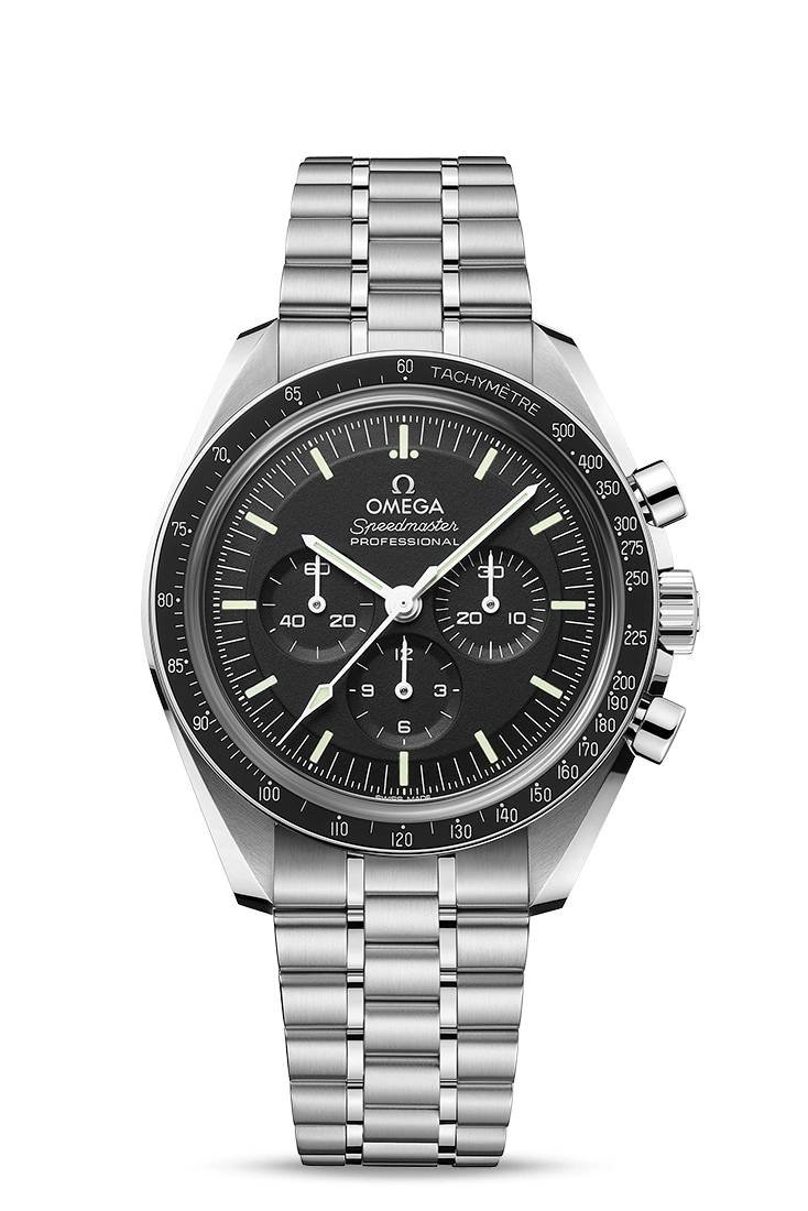 Das Armband dieser 42-mm-Moonwatch aus Edelstahl weist ein Design mit fünf gebogenen, polierten und gebürsteten Gliedern pro Reihe auf. Inspiriert von der 4. Generation der Speedmaster, die auf dem Mond getragen wurde, besitzt das Modell auch ein asymmetrisches Gehäuse mit appliziertem OMEGA Logo, ein schwarz abgestuftes Zifferblatt und den berühmten Punkt über der 90 auf dem Lünettenring aus eloxiertem Aluminium.