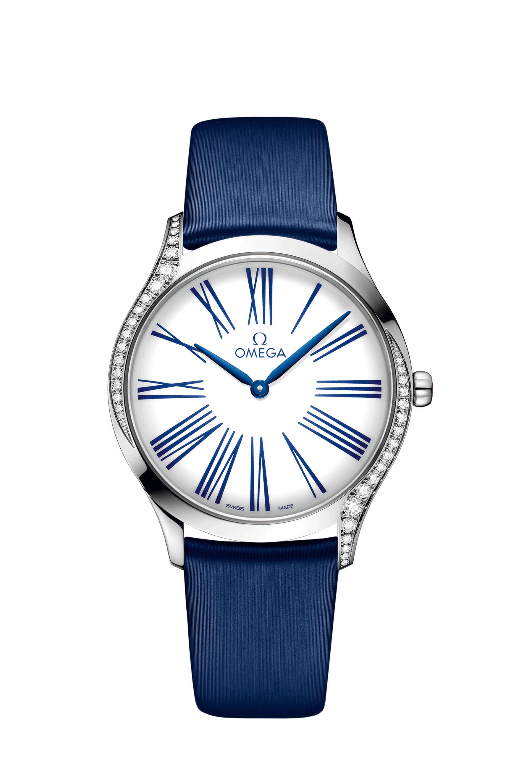Das schlanke Gehäuse besteht aus Edelstahl und ist mit einem Diamantbesatz, der sich an den beiden äusseren Seiten an das Gehäuse schmiegt, sowie einer Krone, die mit roter „HyCeram“ poliert und mit einem Diamanten besetzt ist, versehen. Das weiss lackierte Zifferblatt verfügt über einzigartige versetzte römische Ziffern in Blau und elegante gebläute Zeiger.