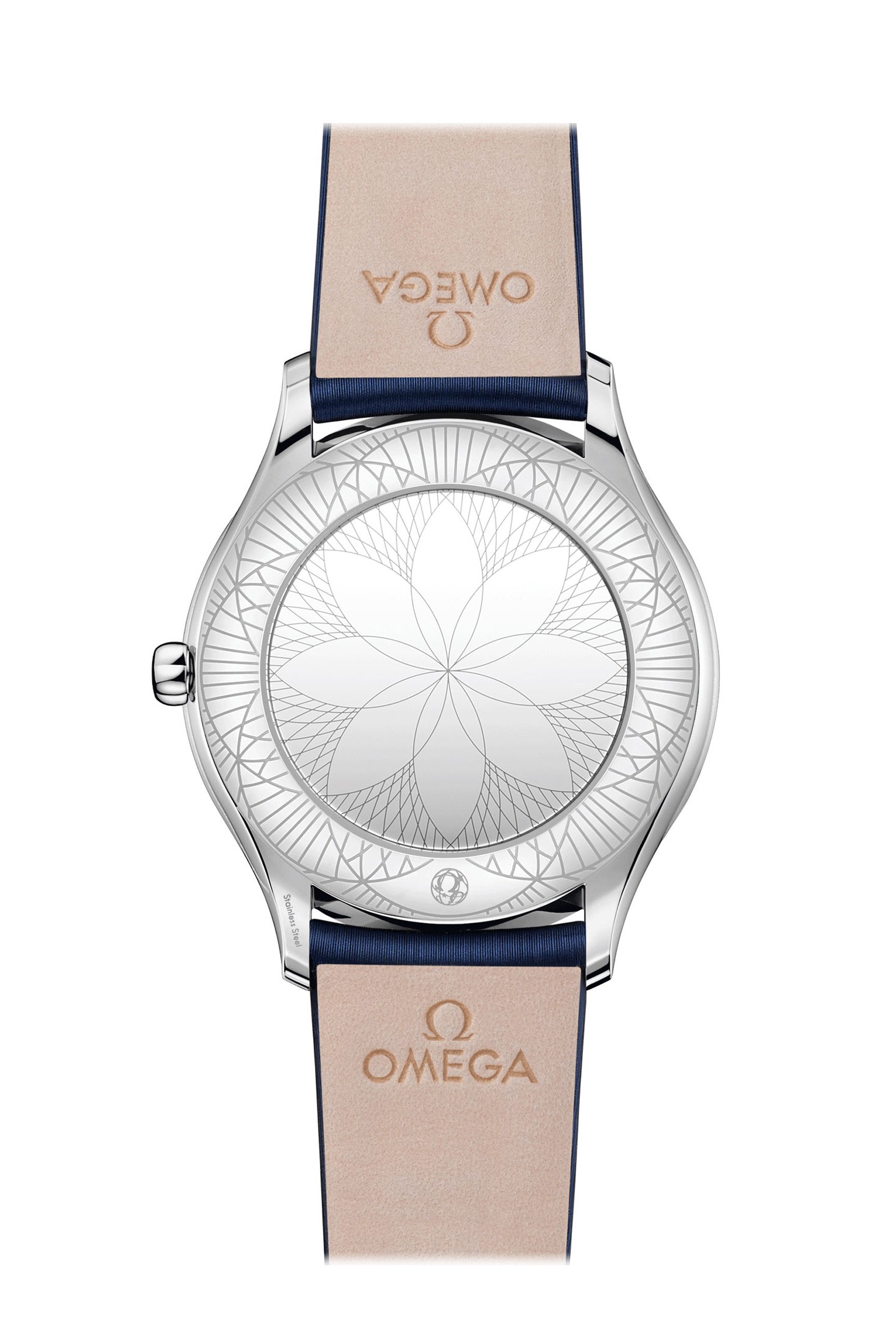 Der Gehäuseboden ist aus speziellem Glas und mit einem „Her Time“-Dekor gefertigt. Abgerundet wird das Ensemble durch ein blaues Textilarmband.